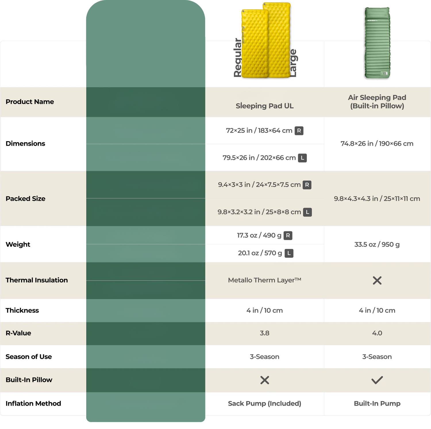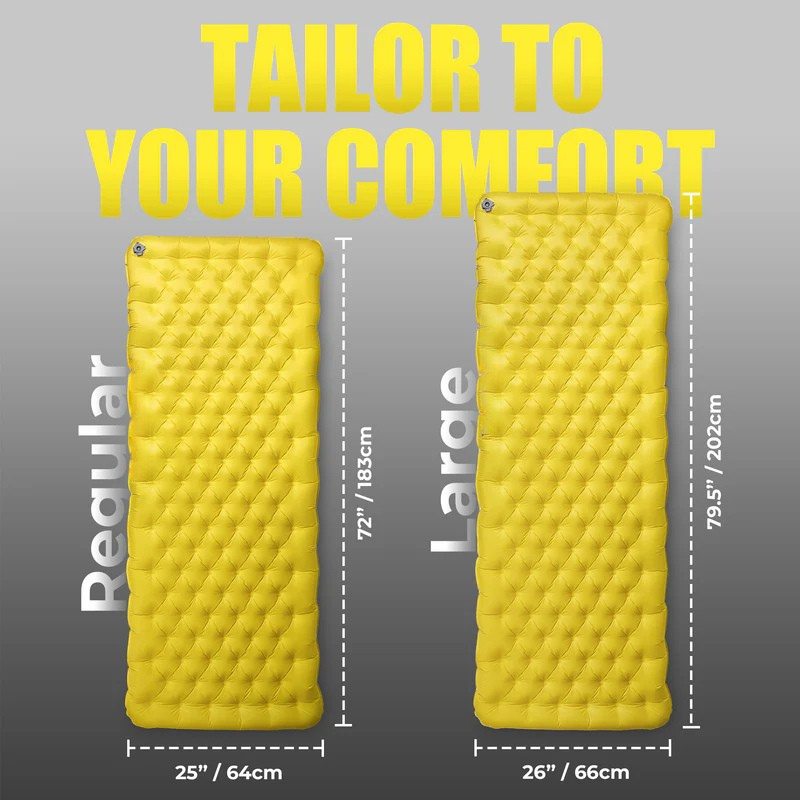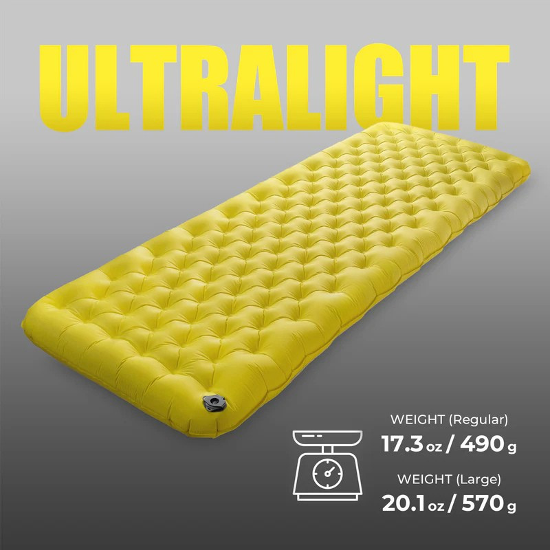 The pad weighs only17.3 oz (490 g)in the Regular size, and20.1 oz (570 g)in the Large size. It packs down to9.4×3×3 in / 24×7.5×7.5 cmin the Regular size, and9.8×3.2×3.2 in / 25×8×8 cmin the Large size, making it perfect for campers and backpackers who want to keep the weight down without sacrificing comfort.